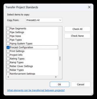 Para equipes estruturais, o Revit 2026.4 introduz uma forma conveniente de transferir Regras de Automação Pré-Moldada entre projetos. Basta transferir configurações de um projeto para outro. O Revit automaticamente sobrepõe as configurações existentes no arquivo de destino, permitindo que você otimize a configuração e garanta consistência em projetos estruturais pré-moldados.