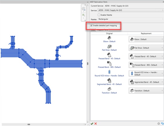 Conectar a intenção de projeto à fabricação continua a evoluir. A ferramenta de Mapeamento de Peças agora suporta mapeamento detalhado para encaixes e componentes em linha, com opções para redefinir os mapeamentos para padrão, manter elementos com falha e habilitar o mapeamento detalhado de peças para maior controle. Essas atualizações fortalecem os fluxos de trabalho do projeto para a fabricação para aplicações MEP e industriais, onde precisão e configurabilidade são importantes.